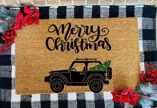 Christmas Tree in Red Truck Merry Christmas Door Mat