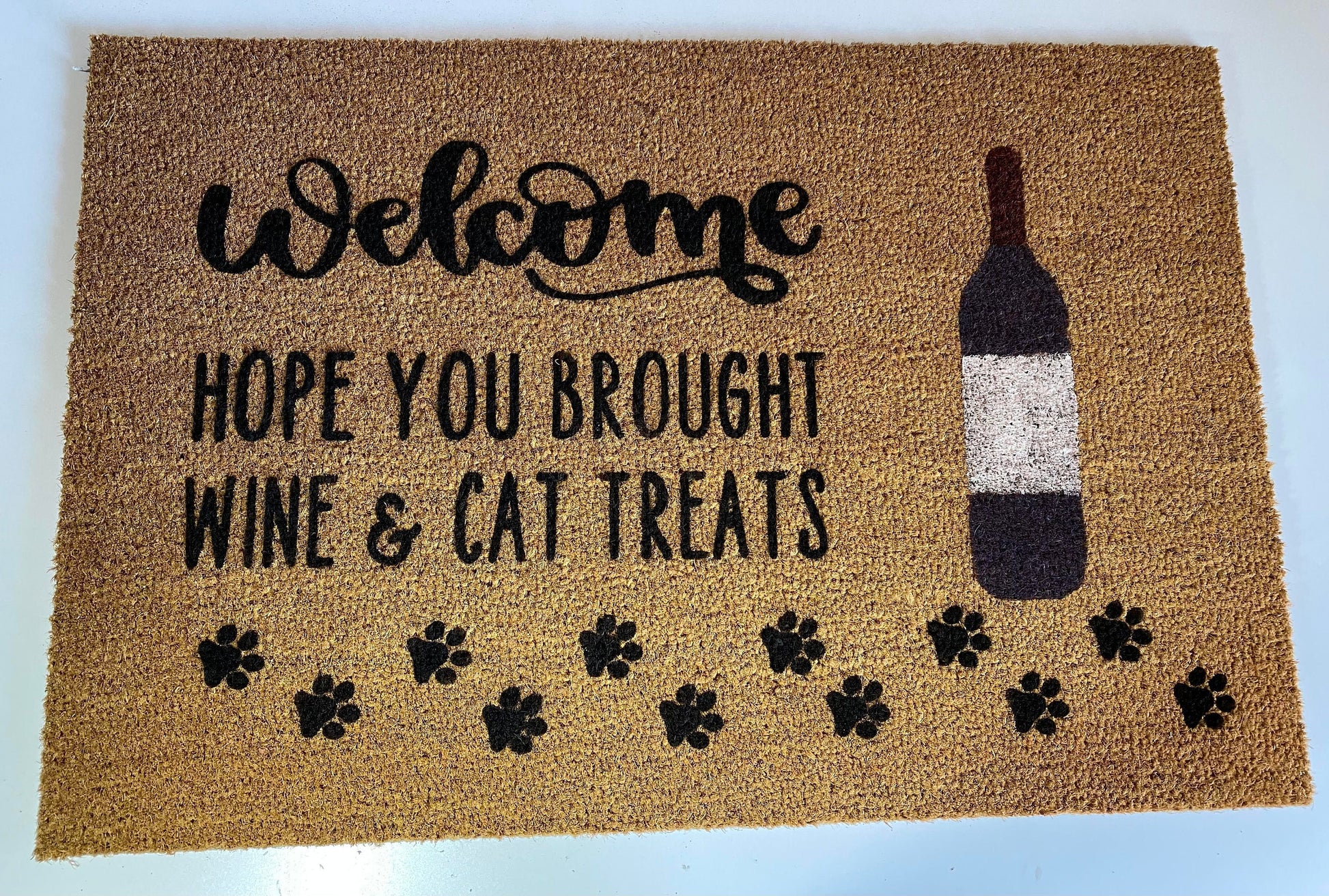 Bienvenido, espero que hayas traído vino y golosinas para gatos Felpudo de fibra de coco fabricado con materiales duraderos y sellado. ¡Fácil de limpiar! La alfombra está respaldada con material antideslizante. Para uso exterior/interior. Para prolongar la vida útil del tapete, manténgalo en un área seca y protegida.